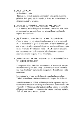 El documento proporciona información sobre particionado de discos duros para sistemas Linux. Explica conceptos como swap, tamaños recomendados para particiones Linux y swap, número máximo de particiones, y qué hacer si se eliminan particiones Linux desde Windows.