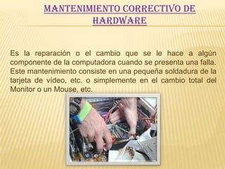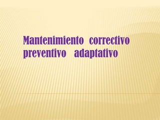 Este documento describe diferentes tipos de mantenimiento de hardware y software, incluyendo mantenimiento correctivo, preventivo y adaptativo. El mantenimiento correctivo implica reparar o reemplazar componentes cuando fallan, mientras que el preventivo busca prevenir fallas. El adaptativo involucra modificaciones para adaptarse a cambios en el entorno tecnológico.