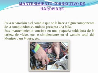 Este documento describe diferentes tipos de mantenimiento de hardware y software, incluyendo mantenimiento correctivo, preventivo y adaptativo. El mantenimiento correctivo implica reparar o reemplazar componentes cuando fallan, mientras que el preventivo busca prevenir fallas mediante actividades como actualizaciones de software. El adaptativo se refiere a modificaciones que permiten que un sistema funcione en entornos cambiantes.