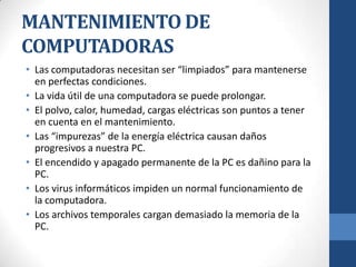 Este documento trata sobre el mantenimiento preventivo de computadoras. Explica que el mantenimiento preventivo incluye limpiar periódicamente el interior de la computadora para eliminar el polvo y realizar ajustes y reemplazos de piezas para prevenir fallas. También recomienda realizar copias de seguridad regularmente y ejecutar programas de diagnóstico para asegurar el correcto funcionamiento de la computadora.