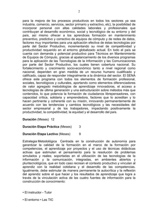 Este documento describe un programa de formación técnica en mantenimiento de equipos de cómputo ofrecido por el SENA en Colombia. El programa dura 12 meses, incluyendo 3 meses de práctica, y capacita a los estudiantes para ensamblar, instalar, configurar y dar soporte a equipos de cómputo, impresoras y redes pequeñas. El programa busca proveer personal calificado para apoyar la adopción de tecnologías de la información en el sector productivo colombiano.
