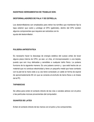 Este documento describe las herramientas y procedimientos empleados para realizar el mantenimiento de una computadora personal. Entre las herramientas se encuentran destornilladores, pulseras antiestáticas, guantes, pinzas, alcohol isopropílico y trapos. El procedimiento incluye limpiar el exterior de la computadora, desconectar los cables, destornillar la carcasa y remover el polvo del interior con una aspiradora o brochas, prestando especial atención a la placa madre, fuente de poder, memoria RAM, unidades de disco y vent