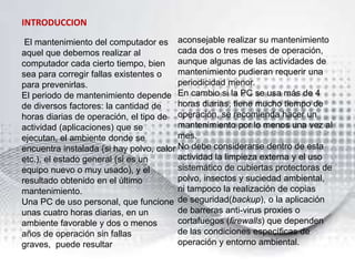 Este documento describe tres tipos de mantenimiento para computadoras: mantenimiento predictivo, mantenimiento preventivo y mantenimiento correctivo. El mantenimiento predictivo se basa en la detección temprana de problemas antes de que ocurran fallas. El mantenimiento preventivo incluye acciones planificadas para prevenir problemas e inspecciones periódicas. El mantenimiento correctivo implica reparar equipos después de que ocurren fallas.