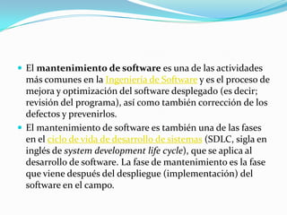 El mantenimiento de software es un proceso importante en el ciclo de vida del desarrollo de sistemas que implica mejorar y optimizar el software implementado, corregir errores y prevenirlos. Dentro de la ingeniería de software se proporcionan soluciones técnicas como la ingeniería inversa, reingeniería y reestructuración del software para abordar el mantenimiento de una manera que reduzca los costos a lo largo del ciclo de vida.
