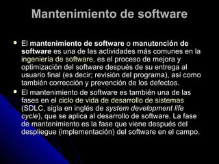 El mantenimiento de software es un proceso importante en la ingeniería de software que implica mejorar y optimizar el software después de su implementación inicial para corregir errores y satisfacer las necesidades cambiantes de los usuarios finales. Existen varios tipos de mantenimiento de software, incluyendo mantenimiento perfectivo para mejorar la calidad, mantenimiento evolutivo para adaptarse a nuevas necesidades, mantenimiento adaptativo para cambios en el entorno técnico y mantenimiento correctivo para arreglar errores.