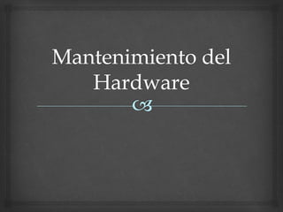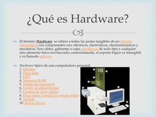 Este documento define hardware y describe sus principales componentes en un sistema computacional. Explica que el hardware incluye todas las partes físicas como la tarjeta madre, CPU, memoria RAM, tarjetas de expansión, fuente de alimentación, unidades de almacenamiento y periféricos. Además, detalla los pasos para realizar el mantenimiento preventivo de estos componentes con el fin de evitar fallas y asegurar un óptimo desempeño.