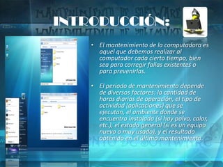 El mantenimiento de la computadora incluye limpiar archivos innecesarios, escanear el disco duro para corregir errores, y desfragmentar el disco para mejorar el rendimiento. Programas como CCleaner y Tune Up Utilities ayudan con la limpieza y optimización del sistema de manera gratuita. Realizar este mantenimiento periódicamente ayuda a prevenir problemas y mantener una computadora más rápida y segura.