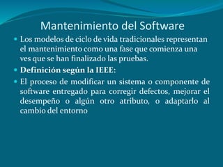 El documento habla sobre el mantenimiento de software. Define el mantenimiento como modificar un sistema de software entregado para corregir errores, mejorar el rendimiento u otros atributos, o adaptarlo a cambios en el entorno. Explica los tipos de mantenimiento, incluyendo perfectivo, adaptativo, correctivo y preventivo. También cubre temas como métricas de mantenimiento, planeación del proceso de mantenimiento y técnicas como la reingeniería.