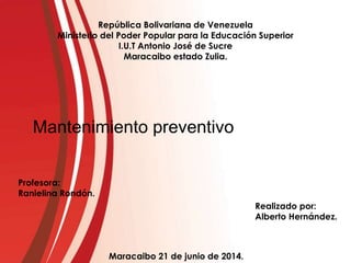 El documento habla sobre los diferentes tipos de mantenimiento de equipos electrónicos, incluyendo mantenimiento preventivo, mantenimiento correctivo y el uso de manuales y software de mantenimiento. Explica las ventajas e inconvenientes de cada tipo de mantenimiento y los componentes clave de un manual de mantenimiento como objetivos, responsabilidades y procedimientos.
