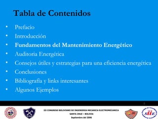 El documento aborda la importancia del mantenimiento energético en empresas, subrayando la necesidad de un enfoque proactivo para mejorar la eficiencia y reducir costos. Se describen pasos para implementar un sistema de gestión energética que incluye auditorías y la participación de todo el personal. Se concluye que la optimización del uso de la energía no solo beneficia a las empresas, sino también a la economía en general.