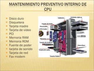 El documento proporciona instrucciones para realizar el mantenimiento de una unidad central de computadora. Recomienda desconectar todos los dispositivos y cables antes de retirar las tarjetas y unidades. Instruye sobre cómo limpiar las tarjetas, ranuras y conectores con brochas y limpiadores. También cubre la limpieza de la fuente de poder y unidades como el disco duro, disquetera y lector de CD-ROM. Finalmente, enfatiza verificar las conexiones antes de volver a armar la computadora.