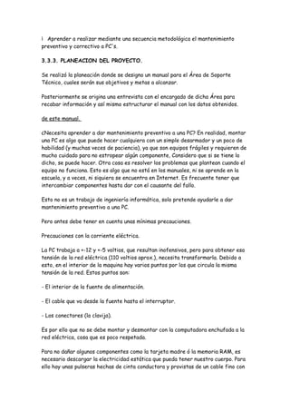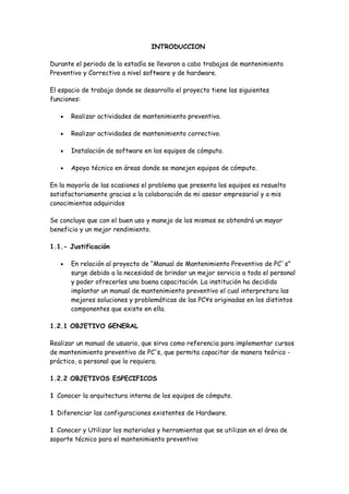El documento describe los trabajos de mantenimiento preventivo y correctivo realizados en software y hardware durante un periodo. Se llevaron a cabo actividades de mantenimiento preventivo, correctivo, instalación de software y apoyo técnico. Se resolvieron problemas de equipos mediante colaboración y conocimientos. Se concluye que un buen uso y manejo de los equipos proporciona mayor beneficio y rendimiento.