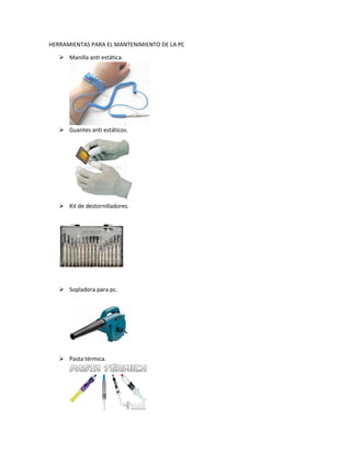 El documento presenta los pasos para el mantenimiento y ensamble de una PC. Explica las herramientas necesarias como manillas antiestáticas, guantes y kits de limpieza. Luego detalla el proceso de desmontaje secuencial de componentes como la unidad óptica, disco duro, memoria RAM, ventiladores, procesador y fuente de poder. Finalmente, indica los pasos de limpieza de cada pieza y la importancia de consultar el manual de la motherboard.