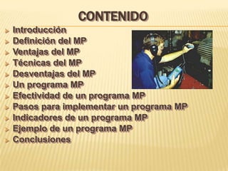 Este documento describe los programas de mantenimiento predictivo, incluyendo su definición, ventajas, técnicas, desventajas y pasos para implementar un programa efectivo. Explica que el mantenimiento predictivo se basa en determinar el estado de la maquinaria en operación para detectar síntomas de fallas incipientes. Algunas técnicas incluyen análisis de aceite, vibraciones y temperaturas. Implementar un programa de mantenimiento predictivo puede incrementar la confiabilidad de la maquinaria y reducir costos.