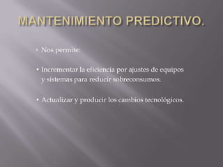 El mantenimiento predictivo permite incrementar la eficiencia y actualizar los cambios tecnológicos mediante el ajuste de equipos y sistemas para reducir sobreconsumos. A través de análisis y mediciones en terreno, se detectan puntos críticos que implican fallas continuas, lo que ayuda a disminuir costos de producción y mantenimiento. El análisis de lubricantes y ultrasonido son herramientas para el monitoreo de condiciones que permiten detectar desgaste, contaminación, fallas y fugas para evitar costos de