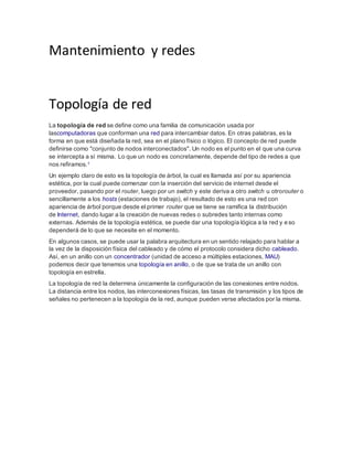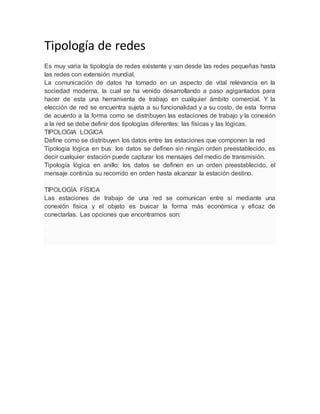 La topología de red se refiere a la forma en que están conectados los nodos de una red, ya sea físicamente o lógicamente. Existen varios tipos de topologías como la topología en árbol, en la que un router principal se ramifica en switches y hosts, o la topología en estrella, donde todos los nodos se conectan a un hub central. La topología determina cómo fluyen los datos entre los nodos pero no aspectos como la distancia entre ellos.