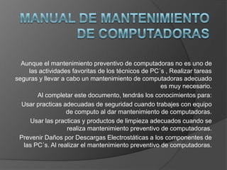 El documento proporciona instrucciones para realizar un mantenimiento preventivo de computadoras. Explica que el mantenimiento preventivo es necesario para mantener las computadoras funcionando correctamente y extender su vida útil. Además, detalla los pasos para limpiar los componentes internos y externos como el monitor, teclado, ratón y la computadora misma.