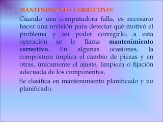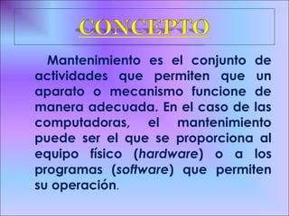 El mantenimiento es el conjunto de actividades que permiten que un aparato o mecanismo funcione de manera adecuada. El mantenimiento de computadoras puede ser hardware o software. El mantenimiento preventivo de computadoras requiere un espacio de trabajo adecuado, herramientas básicas como desatornilladores y pinzas, y suministros de limpieza como aire comprimido, líquido limpiador y franela.