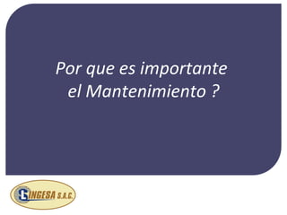 El mantenimiento es importante para garantizar la seguridad y fiabilidad de los equipos, máquinas y entornos de trabajo. Existen dos tipos principales de mantenimiento: correctivo, que se enfoca en reparar fallas, y preventivo, que busca reducir la probabilidad de fallas a través de inspecciones, limpiezas, lubricaciones y reemplazos de partes. El mantenimiento debe realizarse de forma planificada, en un entorno seguro y utilizando equipos adecuados para proteger la salud de los técnicos.
