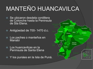 La cultura Manteño-Huancavilca se ubicó entre 700-1470 d.C. en la costa ecuatoriana, y estaba compuesta por los Manteños, Huancavilcas y Punáes. Eran expertos navegantes y comerciantes que intercambiaban conchas spondylus, tejidos, oro, plata y objetos de obsidiana. Tenían costumbres como la deformación craneal, extracción de dientes y sacrificios humanos, y adoraban deidades como la serpiente, el jaguar y la diosa Umiña. Viv