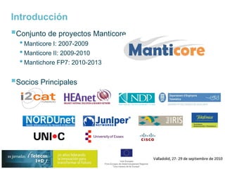 El documento describe el proyecto MANTICORE, que busca permitir el acceso y control de infraestructuras de red por parte de terceros a través de servicios de red virtualizados como IP Network as a Service. MANTICORE ofrece un entorno de software que automatiza los procesos de adquisición y configuración de redes IP para proveedores de infraestructura, servicios de red y usuarios finales a través de un mercado virtual. El proyecto busca implementar y probar estos servicios con tres comunidades de investigación.