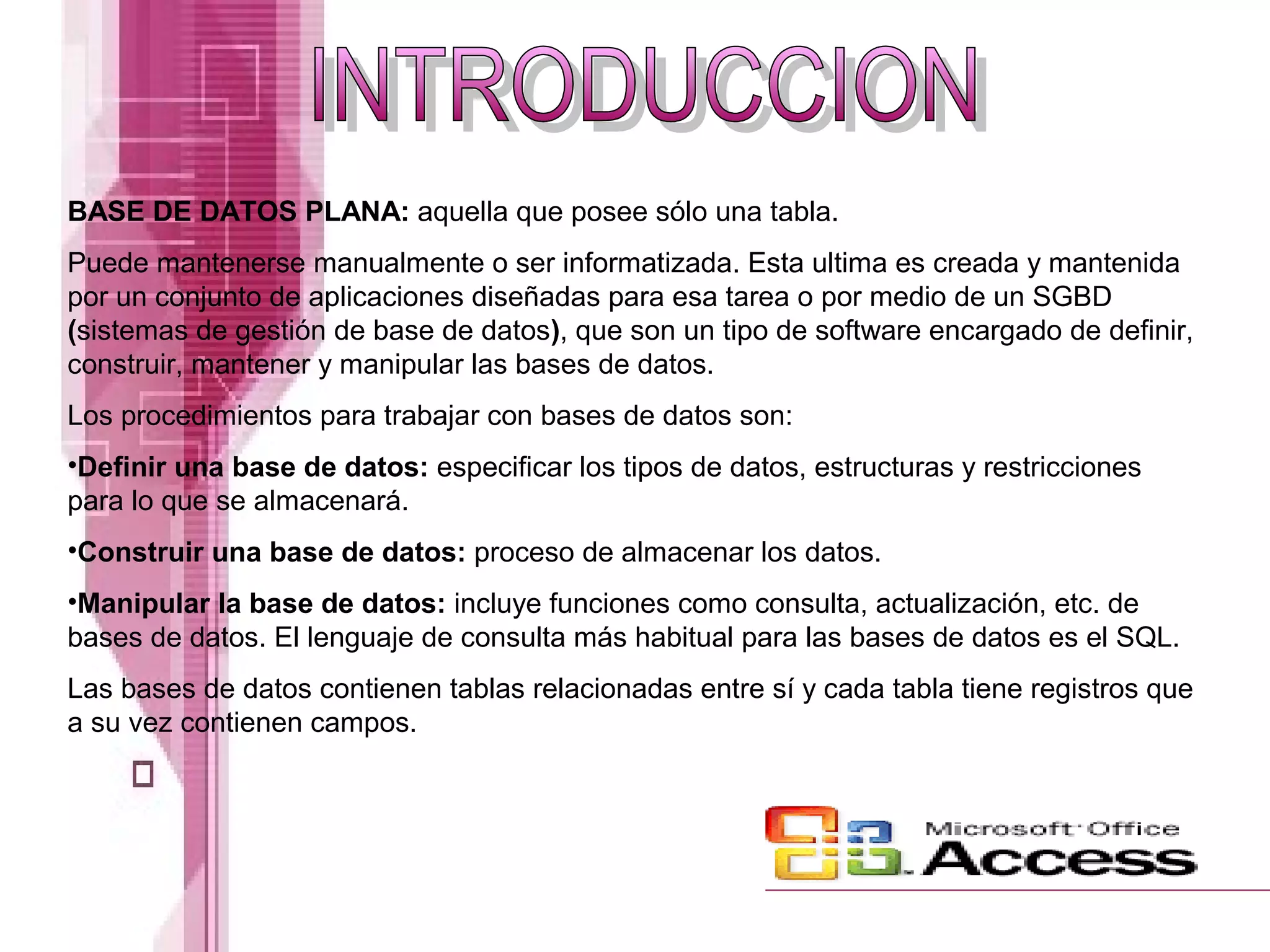 Este documento proporciona información sobre bases de datos, incluyendo su definición, componentes, usuarios, almacenamiento y cómo crear y manejar una base de datos en Microsoft Access. Explica que una base de datos contiene datos relacionados almacenados en tablas y que cuando se crea una nueva base de datos en Access, los datos se almacenan inicialmente en tablas. También describe los pasos para crear una tabla, como examinar los requisitos, seleccionar un método de creación de tabla y asignar un nombre a la nueva tabla.