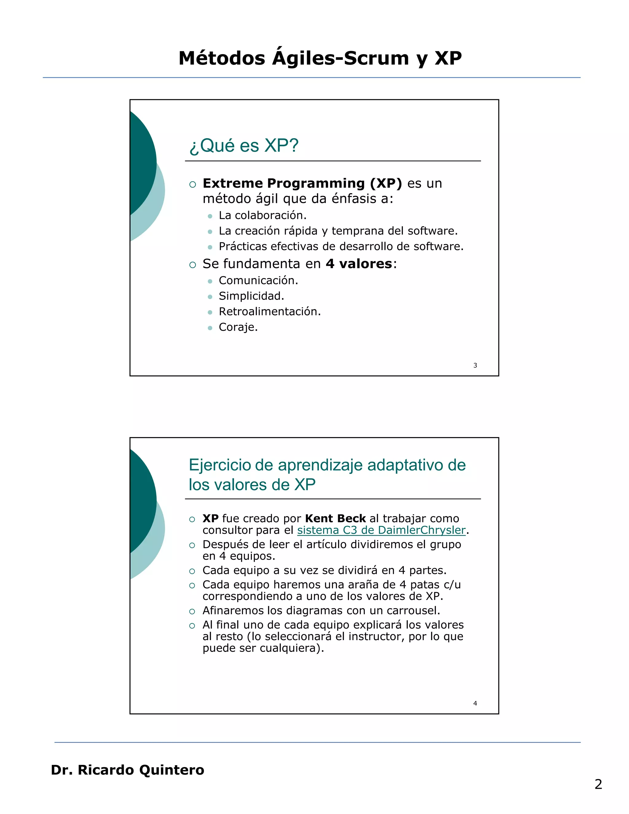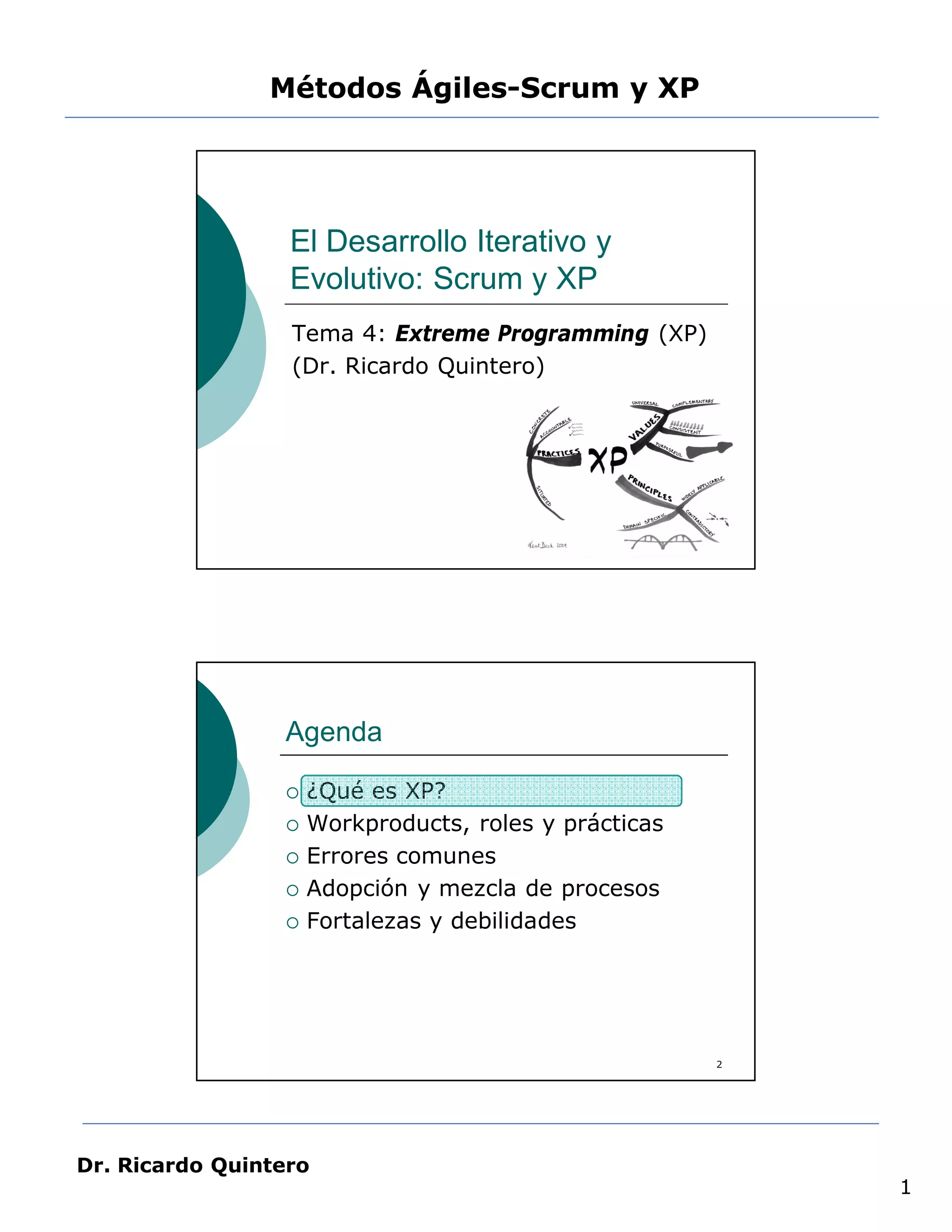 El documento proporciona una introducción a Extreme Programming (XP), uno de los métodos ágiles más conocidos. Describe brevemente los valores fundamentales de XP, sus principales prácticas como programación en parejas y pruebas unitarias, y su énfasis en la comunicación, simplicidad y retroalimentación continua a través de iteraciones cortas. También resume el ciclo de vida típico de XP, incluidas las actividades de planeación, desarrollo e integración iterativa.