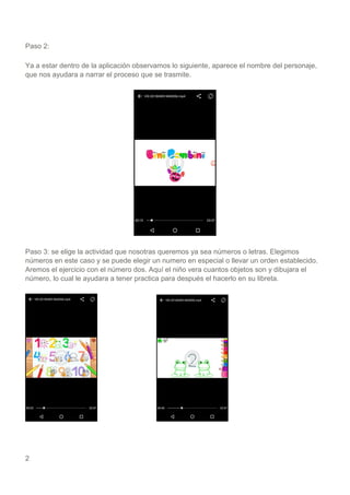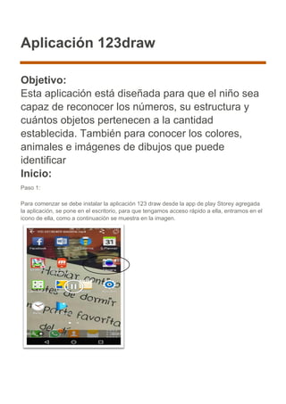 Esta aplicación llamada 123draw está diseñada para que los niños aprendan sobre números, colores, animales e imágenes a través de actividades interactivas. La aplicación guía a los niños paso a paso para reconocer y dibujar números y objetos. Por ejemplo, en una actividad los niños aprenden a dibujar el número 2 y contar 2 objetos, y en otra actividad aprenden a dibujar un caracol trazando su sonrisa, antenas, cuerpo y concha de forma secuencial. El objetivo es que los niños practiquen el recon
