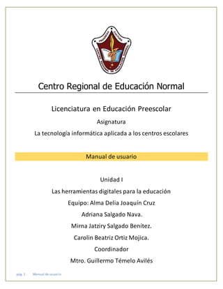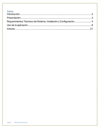 El manual describe una aplicación educativa para niños en edad preescolar. La aplicación contiene seis módulos para enseñar sobre animales, frutas y verduras, letras, números, transporte y actividades. El manual explica cómo instalar la aplicación, navegar entre los módulos y jugar los diferentes juegos de identificación para ayudar a los niños a aprender.
