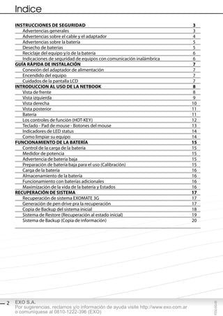 El documento presenta un manual de usuario para la netbook Exomate X355. Contiene instrucciones de seguridad sobre el uso del equipo, la batería y el cable de alimentación. También incluye una guía rápida de instalación, una introducción al uso de la netbook y explicaciones sobre el funcionamiento de la batería y la recuperación del sistema.