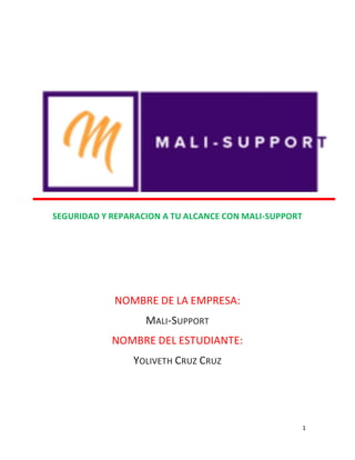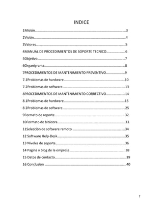 Este documento presenta los procedimientos de soporte técnico de la empresa Mali-Support. Incluye secciones sobre la misión, visión y valores de la empresa, así como procedimientos de mantenimiento preventivo y correctivo para hardware y software. También presenta formatos como el de reporte de daños, bitácora y niveles de soporte técnico de la empresa. El objetivo general es establecer las políticas y sistemas para brindar un servicio de soporte técnico efectivo.