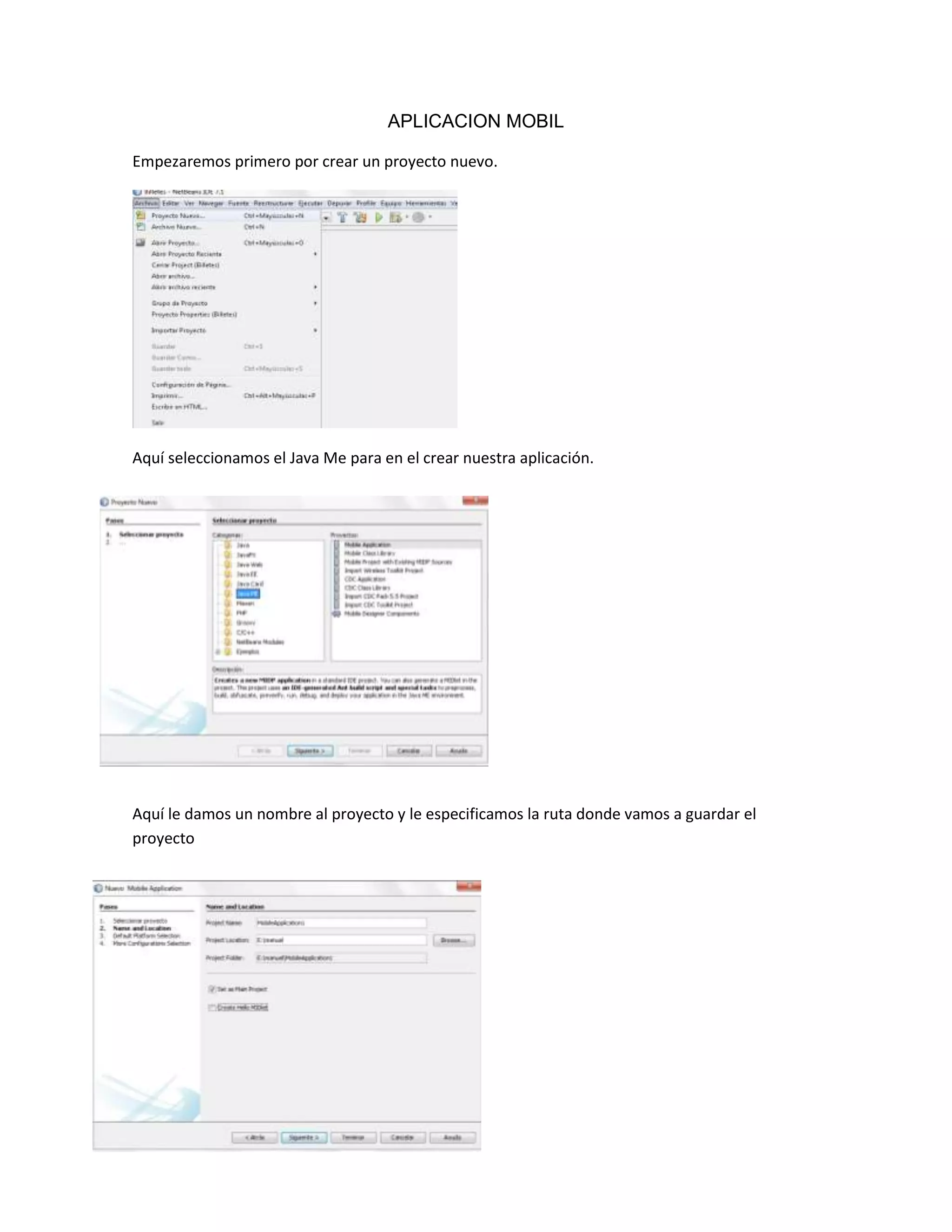 Este documento describe los pasos para crear una aplicación móvil en Java ME. Explica cómo crear un nuevo proyecto de Java ME, seleccionar el dispositivo y nombre del proyecto. Luego muestra cómo agregar un formulario, botones de comando y salida para la interfaz, así como campos de texto personalizables. Finalmente, describe cómo codificar la lógica de la aplicación y probarla.