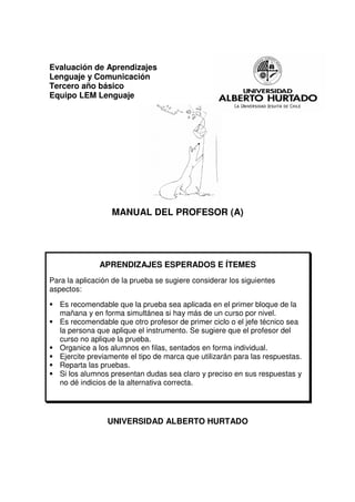 Este documento proporciona recomendaciones para la aplicación de una prueba de lenguaje y comunicación para tercer año básico, incluyendo que sea aplicada por un profesor que no enseña ese curso, que los estudiantes estén organizados individualmente y en filas, y que el profesor no dé indicios de las respuestas correctas. También presenta un texto de ejemplo con preguntas de comprensión lectora y una guía de corrección.