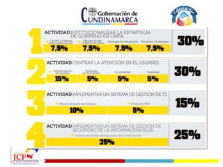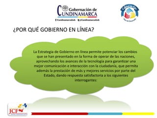 Este documento presenta la estrategia de gobierno en línea de una entidad, la cual busca mejorar la relación del estado con los ciudadanos a través de seis componentes: elementos transversales, información en línea, interacción en línea, transacción en línea, transformación y democracia en línea. Cada componente tiene objetivos específicos como proveer información pública en línea, habilitar espacios de interacción ciudadana, ofrecer trámites virtuales, aumentar la eficiencia interna, e implementar mecanismos