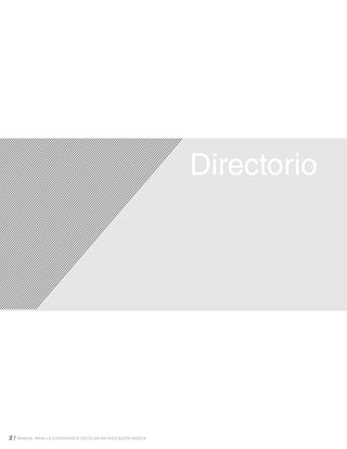 Este documento presenta el Manual para la Convivencia Escolar en Educación Básica en el estado de Puebla, México. El manual establece lineamientos para prevenir la violencia y asegurar un ambiente de aprendizaje seguro para los estudiantes. Incluye declaraciones legales que prohíben el acoso escolar y las represalias, así como las responsabilidades de las escuelas, directores y maestros. También describe las expectativas de conducta para estudiantes y maestros, y los procedimientos para abordar conflictos en la escuela.