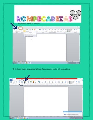 Este documento proporciona instrucciones para crear una sopa de letras y un crucigrama en Microsoft Excel. Explica cómo configurar una cuadrícula para la sopa de letras coloreando celdas y escribiendo palabras. Luego, muestra cómo crear una copia de la hoja para el crucigrama y quitar el color de la sopa de letras original. Finalmente, detalla cómo agregar pistas verticales y horizontales al crucigrama en otra hoja de cálculo.