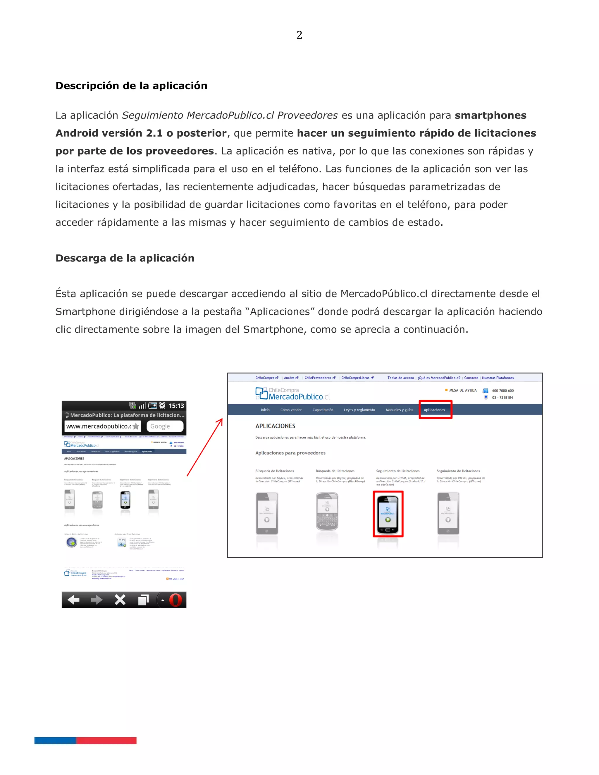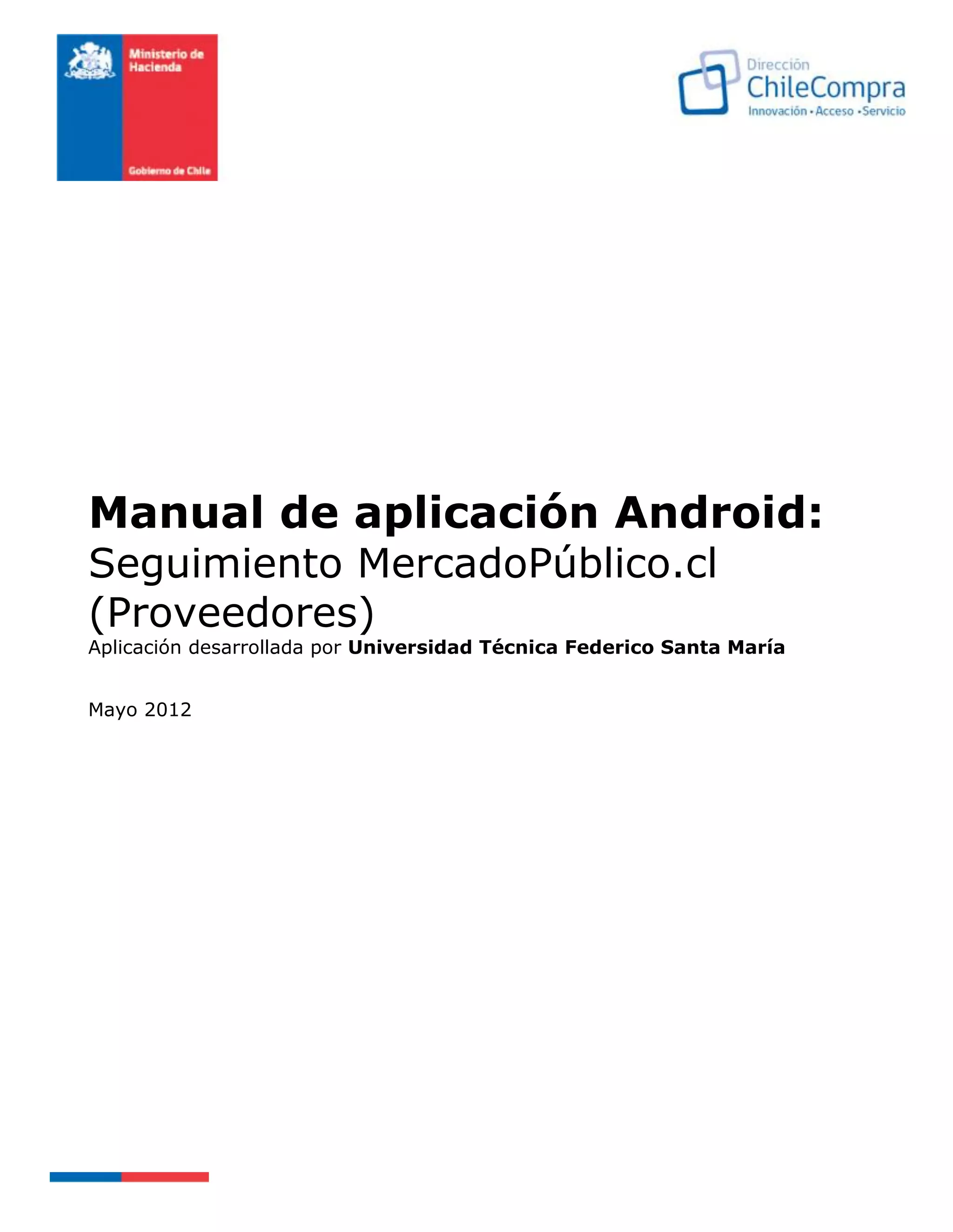 Este documento presenta una aplicación móvil para Android llamada "Seguimiento MercadoPúblico.cl Proveedores", desarrollada por la Universidad Técnica Federico Santa María, que permite a los proveedores hacer seguimiento de licitaciones públicas de manera rápida y simplificada en sus teléfonos móviles. La aplicación puede descargarse desde el sitio MercadoPúblico.cl y ofrece funciones como ver licitaciones ofertadas, adjudicadas y guardar licitaciones favoritas.