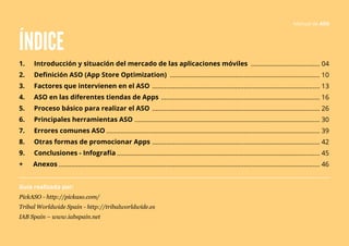 El manual de App Store Optimization (ASO) aborda la optimización de aplicaciones móviles para aumentar su visibilidad y descargas en tiendas como Google Play y App Store. Describe factores críticos como el uso de palabras clave, la importancia de valoraciones y comentarios, así como estrategias para realizar un ASO efectivo. Además, proporciona un panorama del crecimiento del uso de apps y su relevancia en el acceso a internet en España.