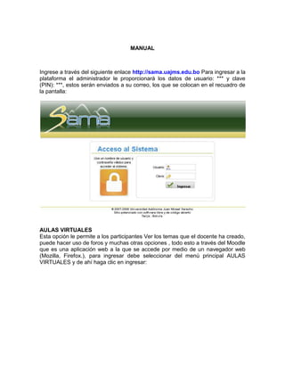 Este manual explica cómo usar las funciones principales de una plataforma de aprendizaje virtual. Describe cómo acceder a las aulas virtuales, foros, tareas y evaluaciones y proporciona instrucciones detalladas sobre cómo usar cada una de estas herramientas. También explica cómo los profesores y estudiantes pueden ver notas, programaciones, información sobre participantes y planes de estudio a través de la plataforma.