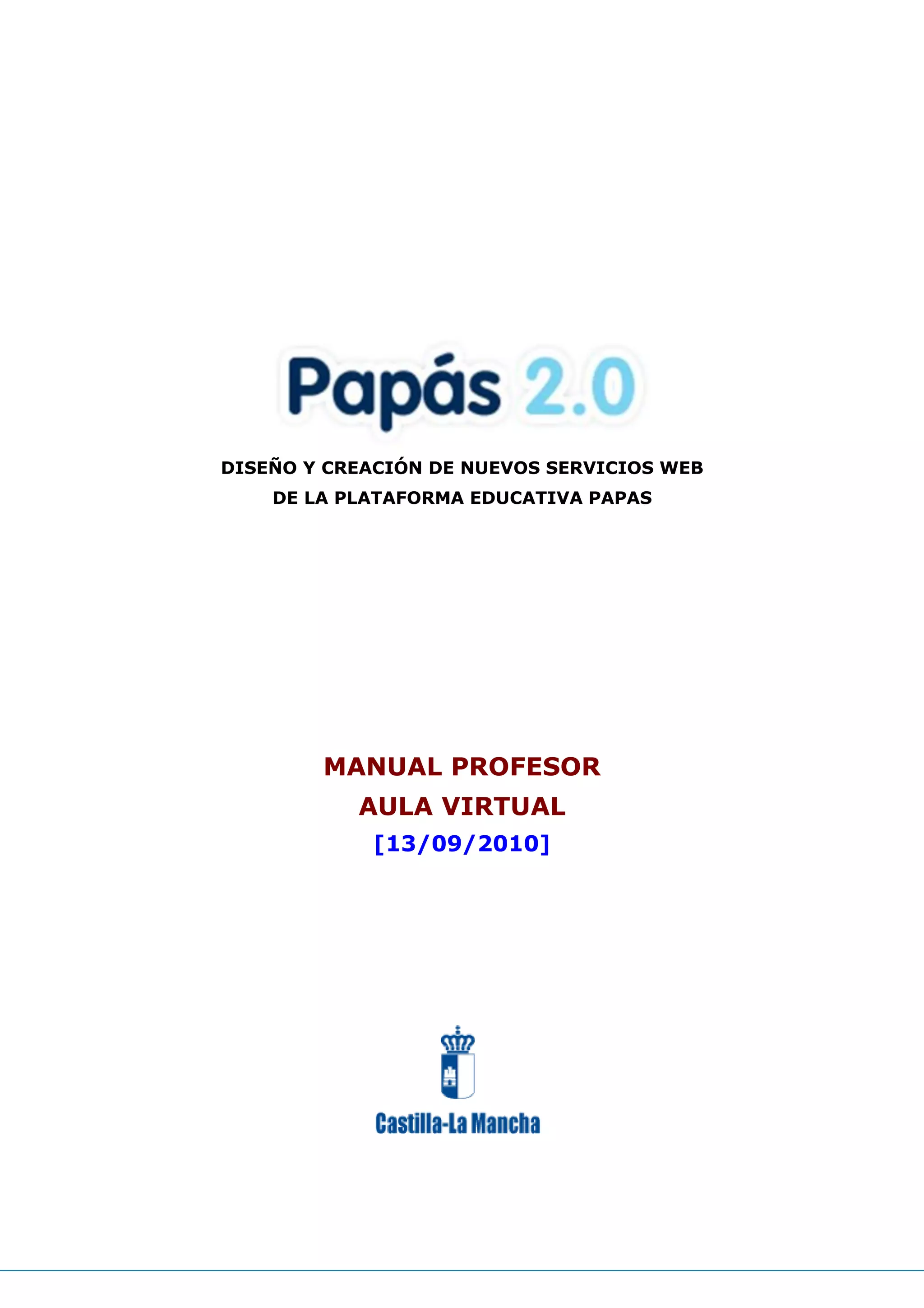 Este documento proporciona instrucciones sobre cómo usar el aula virtual de la plataforma educativa Papas. Explica cómo los profesores pueden crear cursos y espacios de almacenamiento mediante la sincronización con las aulas existentes o la creación de repositorios, y cómo pueden añadir contenido y actividades a los cursos. También describe cómo los estudiantes y padres pueden acceder y navegar por los cursos disponibles.