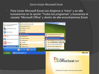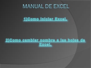 Para iniciar Microsoft Excel, se abre el programa desde el menú "Inicio" yendo a "Todos los programas", luego a "Microsoft Office" y seleccionando Excel. Para cambiar el nombre de una hoja en Excel, se hace clic en la hoja para seleccionarla y luego se cambia el nombre actual en la opción "cambiar nombre" en la parte inferior derecha.