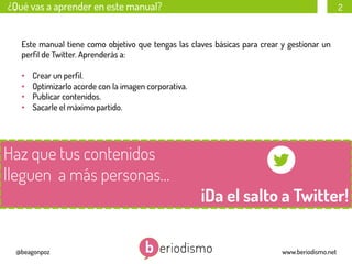 Este manual ofrece claves para crear y gestionar un perfil de Twitter, explicando cómo optimizarlo, publicar contenido y aumentar la visibilidad. Se detalla el funcionamiento de Twitter, sus características principales y su utilidad en el entorno empresarial, incluyendo la interacción con la audiencia y la promoción de contenidos. Además, se incluye un tutorial sobre la creación de la cuenta y las funcionalidades básicas de la plataforma.