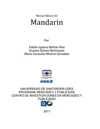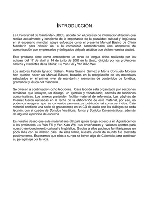 Este documento presenta un manual básico de chino mandarín creado por tres autores de la Universidad de Santander (UDES) en Colombia. El manual contiene ocho lecciones con diálogos, vocabulario y ejercicios sobre temas comunicativos básicos. El documento también incluye información sobre el origen y desarrollo histórico del idioma chino mandarín.