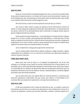 Este documento proporciona una introducción básica a Java, incluyendo qué es Java, para qué sirve, qué es el JDK, JRE y JVM, cómo obtener e instalar el compilador de Java, y cómo crear el primer programa en Java. Explica que Java es un lenguaje de programación orientado a objetos que se usa comúnmente para crear aplicaciones web dinámicas e interactivas y aplicaciones empresariales a gran escala.