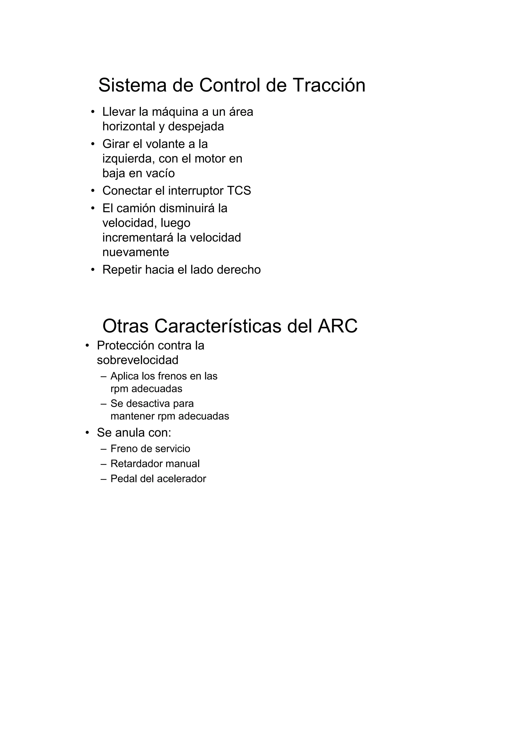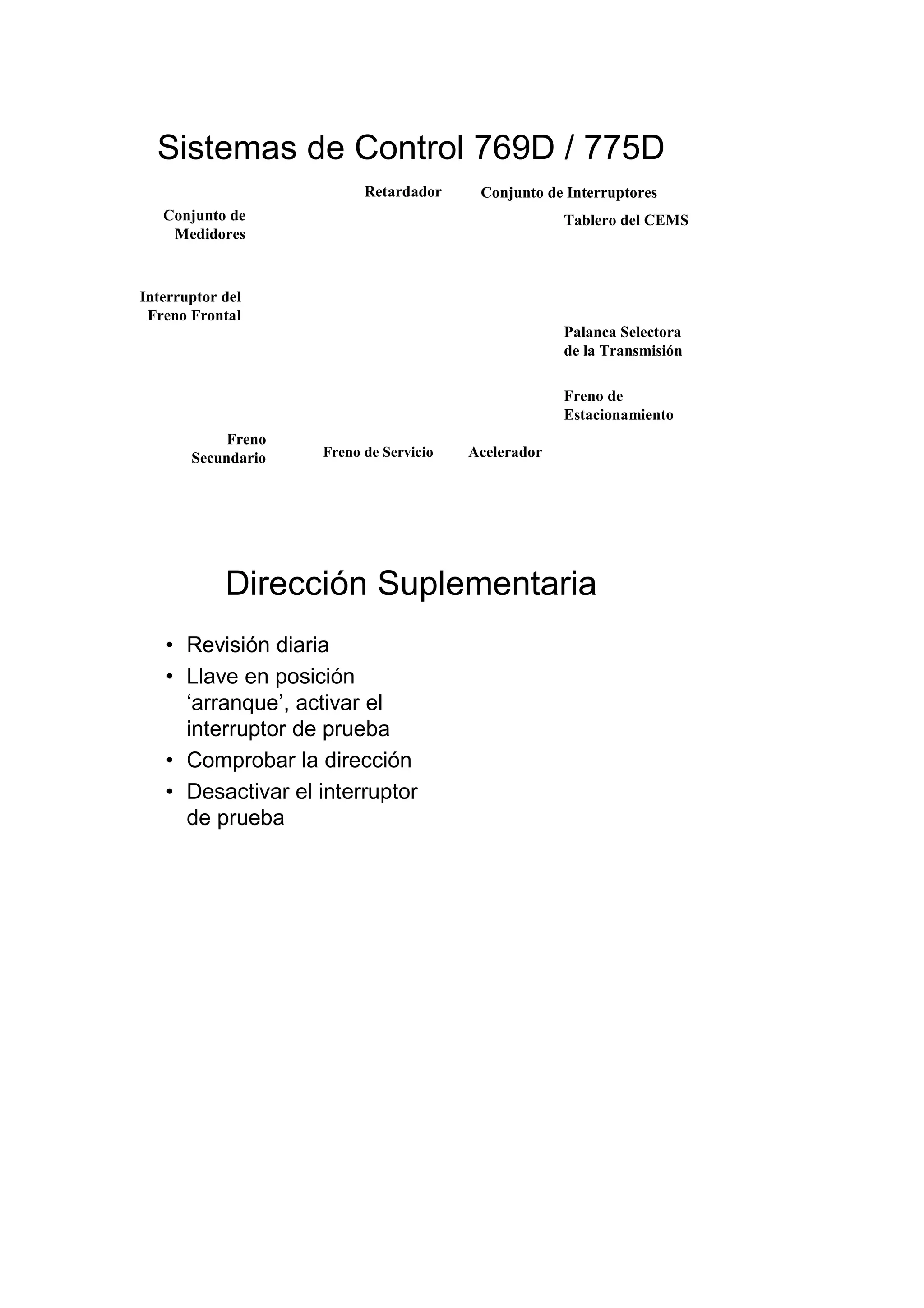 Este documento proporciona instrucciones para la inspección diaria y pruebas de sistemas como el freno de servicio, freno de estacionamiento, dirección suplementaria, sistema de control de tracción, control de levantamiento de caja y más. También describe los símbolos en el tablero de control y la importancia de inspeccionar áreas alrededor de la máquina como el cilindro de levante y comprobar los niveles en los tanques.