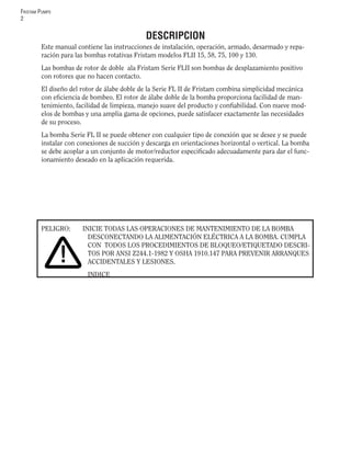 Este documento proporciona instrucciones de instalación, operación y mantenimiento para bombas rotativas de la Serie FLII fabricadas por Fristam. Describe los componentes, especificaciones y diagramas de las bombas, así como procedimientos para el reemplazo de sellos, ejes y rodamientos. El documento también incluye tablas con valores de torsión recomendados y holguras de rotores.