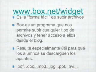 Este documento proporciona instrucciones sobre cómo usar Box.net, un servicio que permite subir archivos a la web y compartirlos. Box.net permite crear "cajas" con archivos que pueden insertarse en blogs. Los usuarios pueden subir archivos, crear carpetas y compartir archivos y carpetas con otros. El sitio web box.net ofrece más opciones para administrar los archivos compartidos y las configuraciones de colaboración.