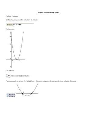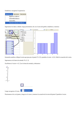 El documento presenta un manual básico de GeoGebra y Wolfram Alpha para realizar operaciones matemáticas, físicas y estadísticas de manera gráfica. Instruye sobre cómo graficar funciones, realizar estadística, geometría analítica, sumas y restas de vectores, cálculo diferencial e integral utilizando estas herramientas.