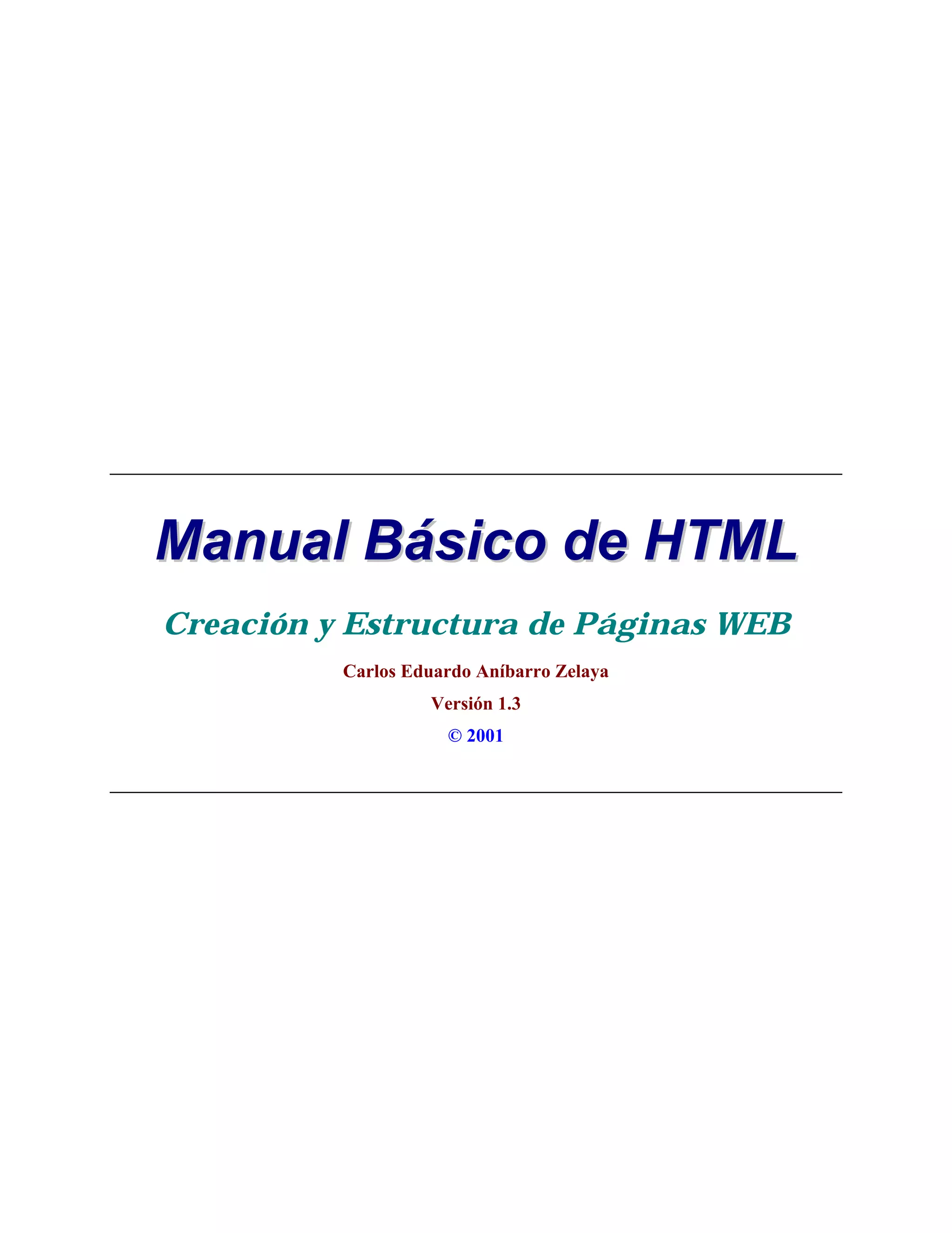 Este documento presenta un manual básico de HTML para la creación y estructura de páginas web. Explica conceptos fundamentales como etiquetas, colores, texto e imágenes en HTML y muestra la estructura básica de una página web con las etiquetas <html>, <head> y <body>. Incluye ejemplos prácticos para aplicar formato y atributos al texto usando etiquetas como <br> y <hr>. El objetivo del manual es enseñar de manera sencilla cómo construir páginas web y sitios web complet