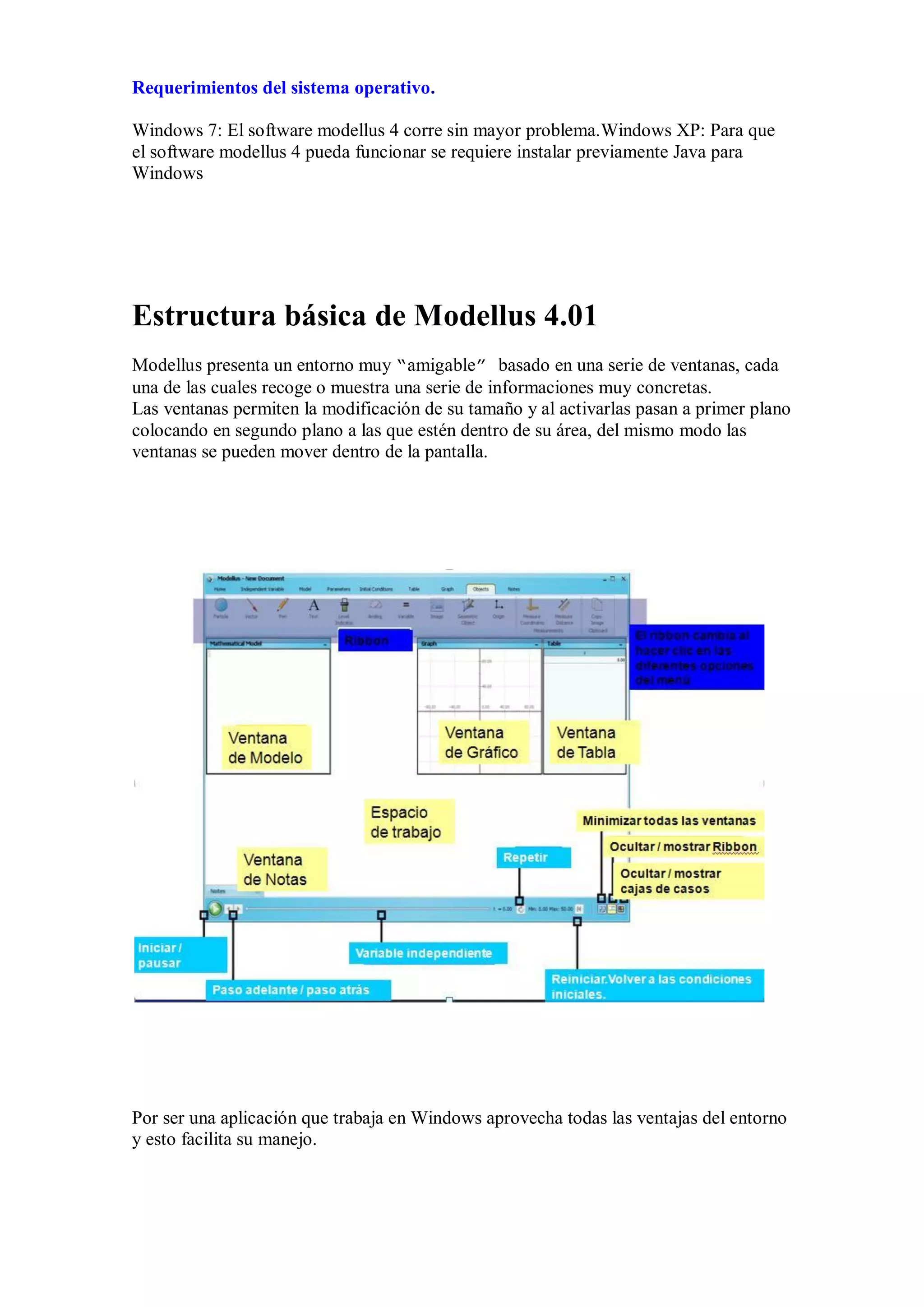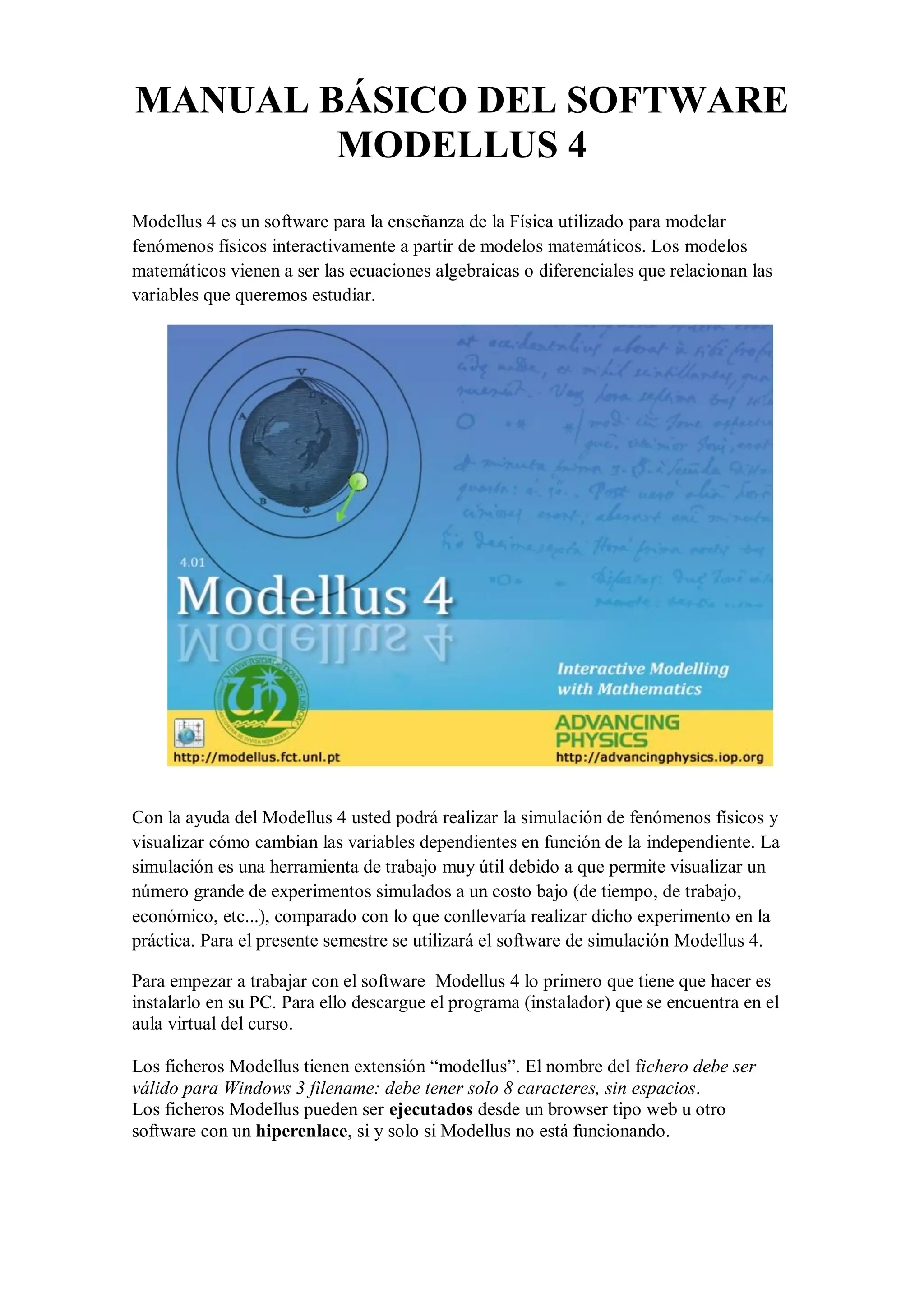 El documento proporciona una introducción al software Modellus 4, que se utiliza para modelar fenómenos físicos a través de ecuaciones matemáticas. Explica cómo instalar y usar el software, incluida la escritura de modelos matemáticos y la simulación interactiva mediante ventanas y objetos gráficos. También cubre los requisitos del sistema, la estructura básica del programa y cómo agregar y editar objetos en las animaciones.